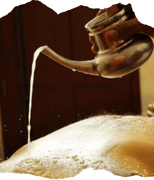 • While the dhanyamla is poured, gentle massage strokes are applied to enhance absorption and circulation